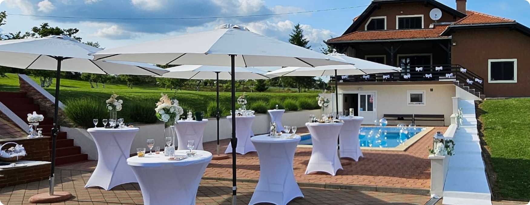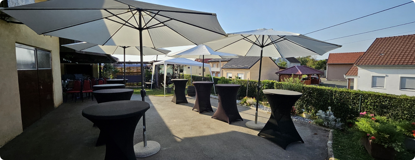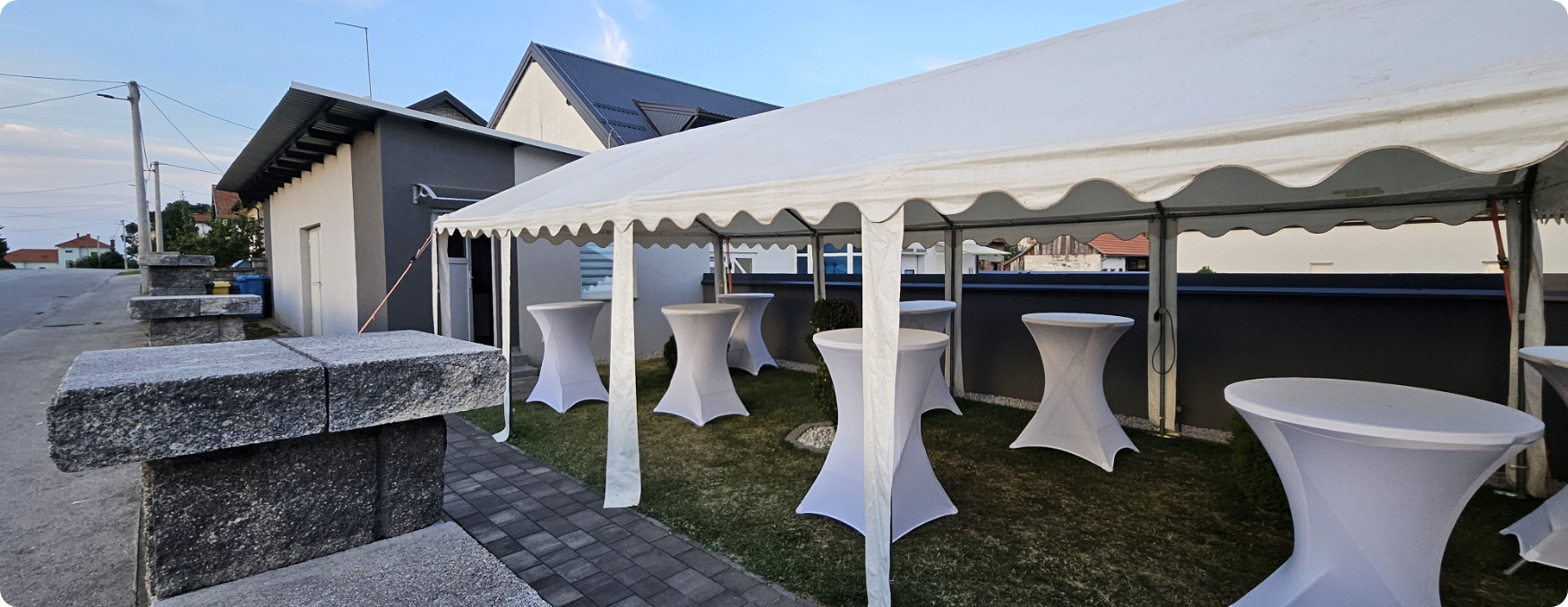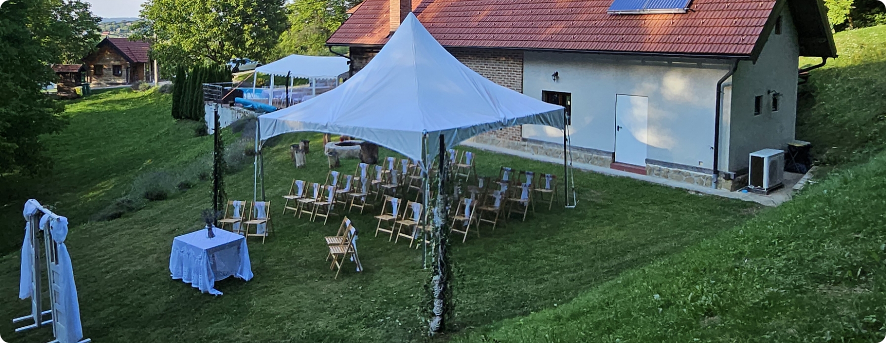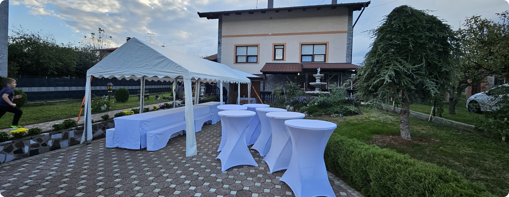 S opremom koju posjedujemo u mogućnosti smo organizirati razne događaje u vanjskim prostorima kao što su rođendani, svadbe, krštenja, krstitke, šatori za sajamske potrebe, razni sportski eventi i sl.